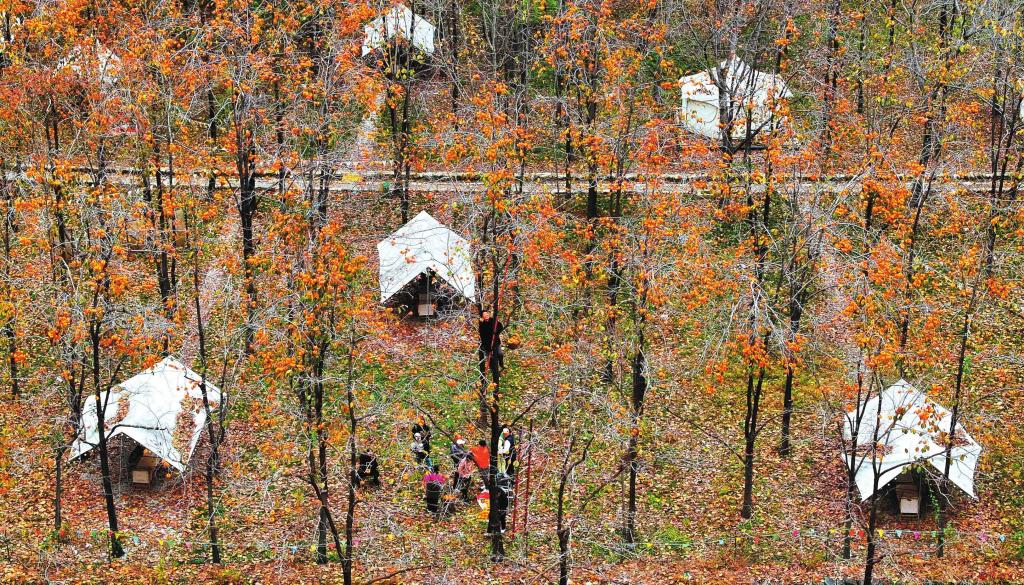 樹上生產(chǎn)力,樹下購買力。霜降時節(jié),位于定襄縣東峪自然保護區(qū)戎家莊的露營基地柿林內(nèi),村民忙著在樹上摘柿子,游客等著在樹下買柿子,給這個美麗的秋天,編織出一幅祥和的圖景。(張晉蘭 攝)