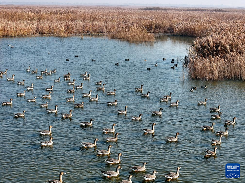 11月30日,群鳥(niǎo)在江蘇興化里下河國(guó)家濕地公園內(nèi)棲息、覓食(無(wú)人機(jī)照片)。(新華社發(fā) 周社根 攝)