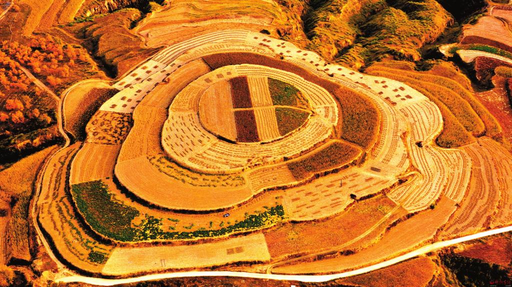 層層梯田滿目金黃,極目遠(yuǎn)眺宛如畫卷。河曲縣鄉(xiāng)村錯(cuò)落有致的梯田與曲折的道路相呼應(yīng),繪出一幅別致的田園風(fēng)光畫。(何 帥 楊成林?jǐn)z)