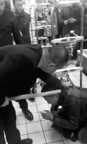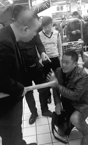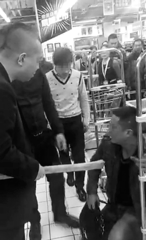 昨天,一段視頻在網(wǎng)上被熱議?!霸俨凰砷_(kāi)把你腿削折了”,一棕色外套男子被逼跪在地上,抱著收銀臺(tái)附近的欄桿連連承諾“再不來(lái)了”。另外兩個(gè)大漢在旁拖拽他,其中一人用木棒打向男子,另一人在旁邊踢了該男子一腳,并威脅道:“再來(lái)讓你沒(méi)命”(如圖)。