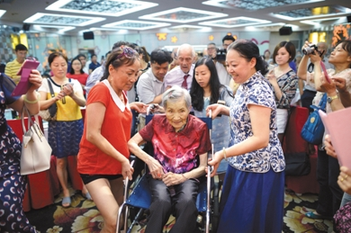 2016年7月9日,重慶雙百歲老人夫妻過生日,子女們特意為他們?cè)诮夥疟宥季频昱e辦了一場雙百盛典。圖/視覺中國