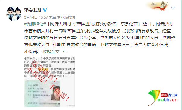 3月14日下午,湖北省洪湖市公安局官方微博@平安洪湖 發(fā)布微博辟謠稱,網(wǎng)傳洪湖村民"韓國(guó)勝"被打要求改名一事系謠言。