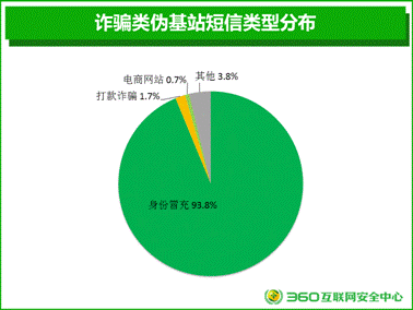 那么,什么是偽基站?安全專家介紹,偽基站一般由主機(jī)和筆記本電腦組成,通過偽裝成運(yùn)營(yíng)商的基站,冒用他人手機(jī)號(hào)碼強(qiáng)行向用戶手機(jī)發(fā)送詐騙、廣告推銷等短信息。這種新型犯罪覆蓋范圍廣,遍布全國(guó)各地,影響人群多,抓捕難度大,嚴(yán)重危害國(guó)家通訊安全和社會(huì)秩序。 根據(jù)360互聯(lián)網(wǎng)安全中心發(fā)布的統(tǒng)計(jì),在所有由偽基站發(fā)送的垃圾短信中,廣告推銷類短信數(shù)量最多,占比高達(dá)42.5%;其次為違法信息類、詐騙信息類的短信,占比分別為33.8%和22.8%。 安全人員對(duì)詐騙類偽基站短信內(nèi)容進(jìn)行篩選和分析發(fā)現(xiàn),身份冒充類偽基站短信占到了絕大部分,占比為93.8%,打款詐騙(1.7%)、電商網(wǎng)站(0.7%)位列其后。