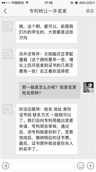 在一家機(jī)構(gòu)網(wǎng)店上,北青報(bào)記者看到,曾經(jīng)購買過“實(shí)用新型專利申請(qǐng)或轉(zhuǎn)讓”的賣家評(píng)價(jià)稱,“感覺很方便,不用自己一個(gè)人絞盡腦汁熬夜了,服務(wù)為自己省了很多力,果然人多力量大,相信最后能拿到證書?!?/p>