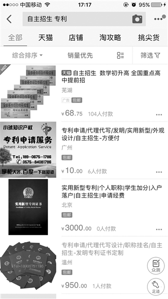 市場(chǎng)需求使得部分專利代理公司打起了高中學(xué)生群體的主意。北青報(bào)記者在淘寶網(wǎng)上以“自主招生專利”為關(guān)鍵詞進(jìn)行搜索,發(fā)現(xiàn)有多家知識(shí)產(chǎn)權(quán)服務(wù)機(jī)構(gòu)的網(wǎng)店寫明可以提供“專利申請(qǐng)”、“專利轉(zhuǎn)讓”等服務(wù),并注明專利是“自主招生考試通行證”。