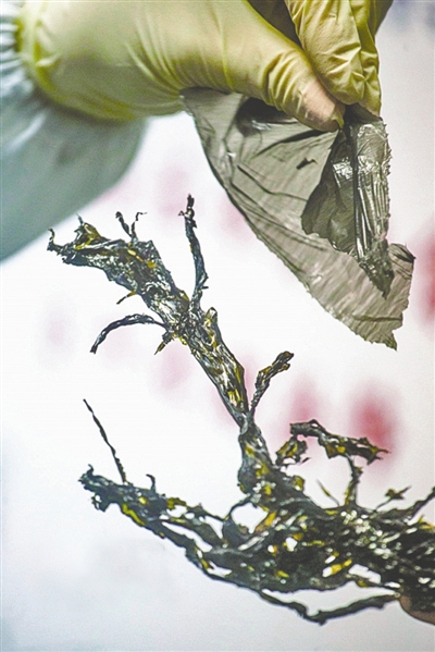 福建省水產(chǎn)加工流通協(xié)會(huì)的報(bào)告稱,受謠言的影響,該省紫菜產(chǎn)業(yè)保守估計(jì)損失將達(dá)到數(shù)千萬(wàn)元甚至上億元。為澄清傳聞,北京、福建、廣東等地近日對(duì)市場(chǎng)上的紫菜進(jìn)行了檢查或?qū)嶒?yàn)室鑒定。圖為廣州CEC食品安全檢測(cè)中心,對(duì)比干的紫菜和薄塑料袋。