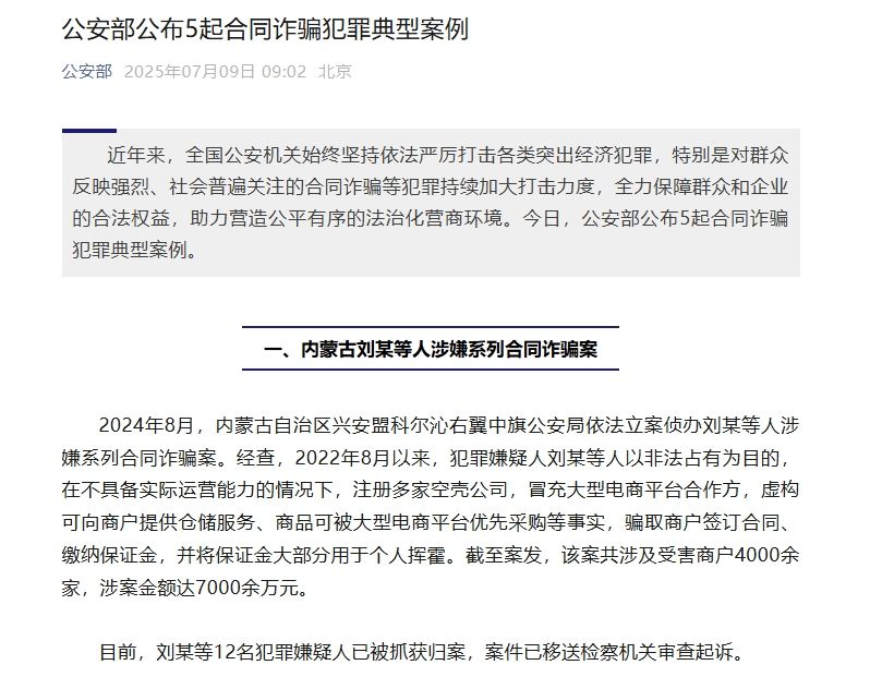 2024年8月,內(nèi)蒙古自治區(qū)興安盟科爾沁右翼中旗公安局依法立案偵辦劉某等人涉嫌系列合同詐騙案。經(jīng)查,2022年8月以來,犯罪嫌疑人劉某等人以非法占有為目的,在不具備實(shí)際運(yùn)營能力的情況下,注冊多家空殼公司,冒充大型電商平臺(tái)合作方,虛構(gòu)可向商戶提供倉儲(chǔ)服務(wù)、商品可被大型電商平臺(tái)優(yōu)先采購等事實(shí),騙取商戶簽訂合同、繳納保證金,并將保證金大部分用于個(gè)人揮霍。截至案發(fā),該案共涉及受害商戶4000余家,涉案金額達(dá)7000余萬元。