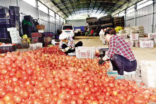 6 月22 日,定襄縣受祿鄉(xiāng)富達(dá)農(nóng)業(yè)合作社的農(nóng)戶們將采摘的西紅柿裝筐準(zhǔn)備外銷。近年來,定襄縣立足自然資源優(yōu)勢,積極引導(dǎo)農(nóng)民調(diào)整產(chǎn)業(yè)結(jié)構(gòu),大力發(fā)展設(shè)施農(nóng)業(yè),促進(jìn)了農(nóng)業(yè)增效、農(nóng)民增收。(張玉虎 攝)