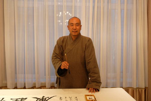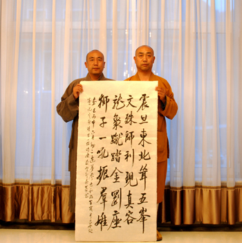 利用閑暇,筆者與行腳僧進行了簡單溝通,了解到法師來自廣東省韶關(guān)云門山大覺禪寺,法名圣泰,是云門宗第十五代弟子,酷愛書法,且仰慕五臺山多時,此行特用且行且書的方式了卻多年朝圣心愿。
