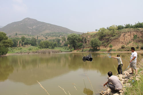 “昔日有水水白流、只見黃土不見魚”的五臺(tái)縣陽(yáng)白鄉(xiāng)桑院村,在五臺(tái)農(nóng)商銀行陽(yáng)白支行信貸人員的倡導(dǎo)下,依靠“項(xiàng)目攻堅(jiān)”、“金融扶貧”、“農(nóng)貸進(jìn)萬(wàn)家”等惠民政策,在黃土塬上打壩蓄水建起20畝魚塘,投放鯉魚、白鰱魚等魚苗2萬(wàn)尾,3斤以上的鮮魚已讓山里人大飽口福。圖為網(wǎng)袋捕魚。(俊賢 鄭光 先良)