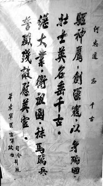 何忠道的犧牲,引起了整個(gè)空軍系統(tǒng)的震憾,人民空軍舉行了隆重的追悼大會(huì)??哲姍C(jī)關(guān)、華東軍區(qū)、生前所在部隊(duì)機(jī)關(guān)、戰(zhàn)友送了幾十幀挽幛??哲娝玖顔T劉亞樓、副司令員常乾坤、副政委吳法憲、參謀長(zhǎng)王秉璋聯(lián)名敬獻(xiàn)的挽幛上書(shū):“殲滅美國(guó)侵略者,堅(jiān)決保衛(wèi)祖國(guó)領(lǐng)空,為何忠道同志復(fù)仇!”華東軍區(qū)司令部、政治部敬獻(xiàn)的挽幛上書(shū):“驅(qū)神鷹,創(chuàng)飛寇,以身殉國(guó),壯士英名垂千古。創(chuàng)大業(yè),衛(wèi)祖國(guó),秣馬厲兵,誓殲殘敵慰英靈。”