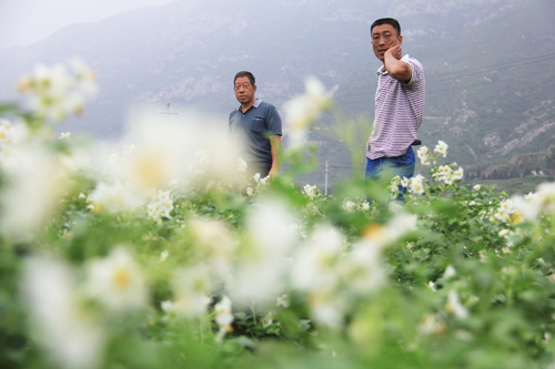 8月13日,原平市紅池村民正在土豆地里查看長勢,兩人看著喜人的土豆開心的笑了。原平市山區(qū)農(nóng)民根據(jù)土地土壤結(jié)構(gòu)松散的特點(diǎn),以種植土豆為主要農(nóng)作物,不分地塊大小,也不論坡地還是平地,長出的土豆個頭大好吃,既可以當(dāng)主食食用,也可以制作為蔬菜,一食多用,是餐桌上的香餑餑,銷售價(jià)格節(jié)節(jié)攀升,是山區(qū)百姓脫貧致富的金圪蛋。(吉建平 攝)