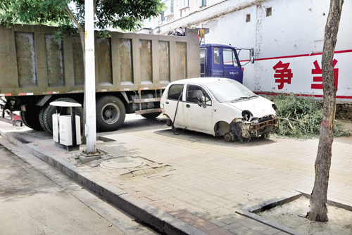 附近的居民們稱,人行道本來就不寬,這樣的“僵尸車”長年累月停放在路邊不僅有礙觀瞻,而且對市民的出行造成了不小的影響。記者認(rèn)為,這些“僵尸車”如果廢棄不用的話,就該進(jìn)行報廢處理,而不是一直停放在路邊。希望車主能夠盡快現(xiàn)身對車輛進(jìn)行處理,同時也希望交警部門能夠加大監(jiān)管執(zhí)法力度,讓“僵尸車”的身影不再出現(xiàn)在街頭巷尾。圖為廢棄的汽車。(王君 攝)