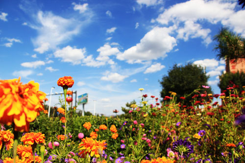 原平一座美麗富饒的北方小城,進入秋天,仍然是美不勝收,鮮花簇?fù)?,泛黃的枝頭掛在秋天的果實,陪襯著藍(lán)天白云。