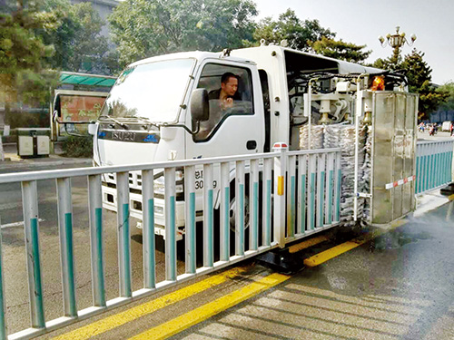 交通護(hù)欄可為市民、車輛出行提供安全保障,可人工清洗護(hù)欄工作耗時(shí)耗力,還存在安全隱患。新購置的護(hù)欄清洗車通過伸縮刷子以及車載水箱噴出的水流,完成護(hù)欄清洗,工作效率遠(yuǎn)遠(yuǎn)高于人工清洗,省時(shí)又省力,效果還明顯。圖為清洗車正在對(duì)城區(qū)交通護(hù)欄進(jìn)行清洗。(張志遠(yuǎn) 孫明 攝)