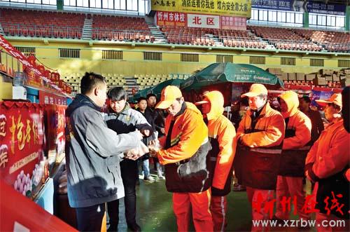 1月19日上午,山西熊奪寶網(wǎng)絡(luò)科技有限公司面向忻州市環(huán)衛(wèi)系統(tǒng)開展“獻(xiàn)愛心迎佳節(jié)”活動,來自忻州市市容環(huán)境衛(wèi)生管理處的50名環(huán)衛(wèi)工人代表,每人領(lǐng)到了一份新鮮雞蛋。現(xiàn)場的一位工作人員告訴記者:“環(huán)衛(wèi)工人們?yōu)榱顺鞘械母蓛粽麧嵏冻隽诵燎诘暮顾M@些雞蛋能為他們補(bǔ)補(bǔ)身體。除現(xiàn)場領(lǐng)取雞蛋的50名環(huán)衛(wèi)工人之外,我市另外的1000多名環(huán)衛(wèi)工人也將陸續(xù)領(lǐng)到愛心雞蛋。”領(lǐng)到雞蛋的環(huán)衛(wèi)工李大姐高興地說:“今年過年雞蛋也不用買了,實(shí)在是太好了!”(王菲 郭劍鳴 攝)