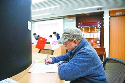 4月3日,中華遺囑庫第二登記中心揭牌成立,前來體驗遺囑辦理程序的老人蔡先生正在填寫相關(guān)登記表。(記者 和冠欣 攝)