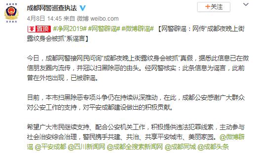 4月8日,成都網(wǎng)警對此辟謠稱:接網(wǎng)民問詢“成都夜晚上街露紋身會被抓”真假,據(jù)悉此信息已在微信朋友圈內(nèi)流傳,并冠以掃黑除惡的由頭。經(jīng)網(wǎng)警核實,此條信息為謠言,此前曾在外地出現(xiàn),已被辟謠。目前,本市掃黑除惡專項斗爭仍在持續(xù)縱深推動,在此,成都公安感謝廣大群眾對公安工作的支持,對平安成都建設做出的積極貢獻。希望廣大市民繼續(xù)支持、配合公安機關工作,積極提供違法犯罪線索,主動參與社會治安綜合治理,警民攜手共建、共治、共享平安城市、美麗家園。