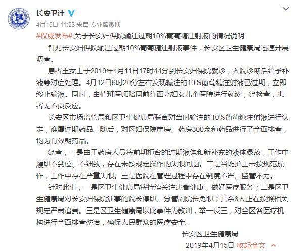 長安區(qū)市場監(jiān)管局和區(qū)衛(wèi)生健康局聯(lián)合對(duì)當(dāng)時(shí)輸注的10%葡萄糖注射液進(jìn)行認(rèn)定,確屬過期藥品。隨后,對(duì)區(qū)婦保院庫房、藥房300余種藥品進(jìn)行了全面排查,均為有效期藥品。
