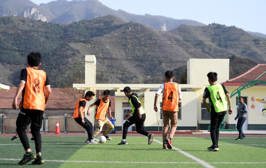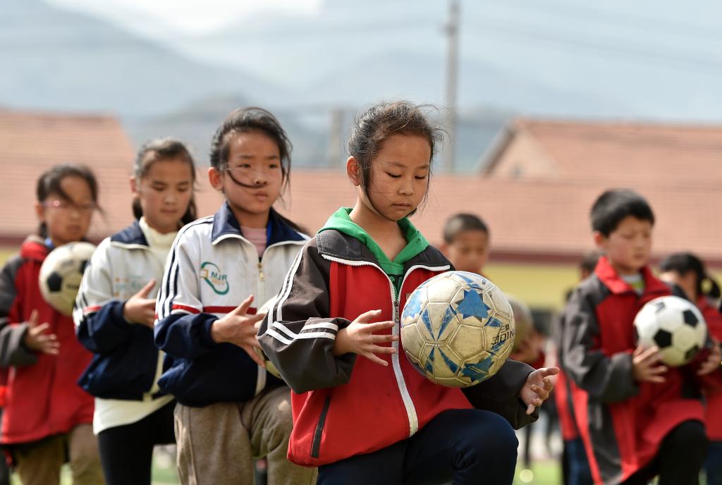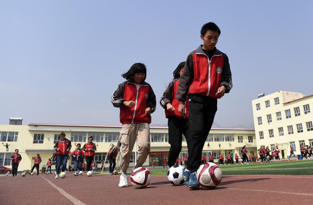 ↑這是學(xué)生們?cè)隗w育課上進(jìn)行射門(mén)訓(xùn)練(4月18日攝)。新華社記者李俊東攝