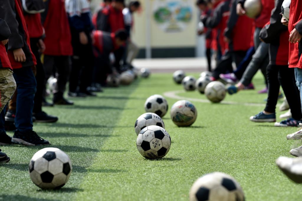 ↑這是初三116班的足球隊隊員在比賽開始前為自己加油鼓勁(4月17日攝)。新華社記者詹彥攝
