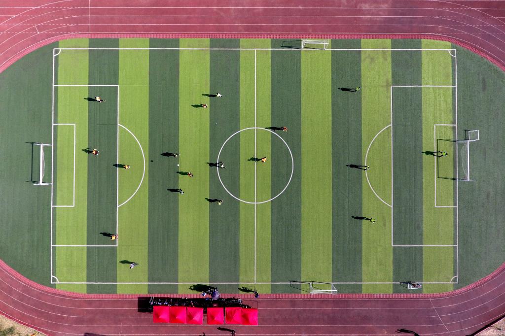 ↑這是初中組男子足球隊隊員們在進(jìn)行分組對抗賽(4月17日無人機拍攝)。新華社記者詹彥攝