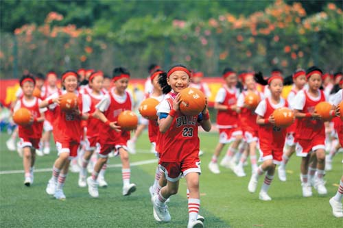 學(xué)生在運(yùn)動(dòng)會上展示集體籃球操