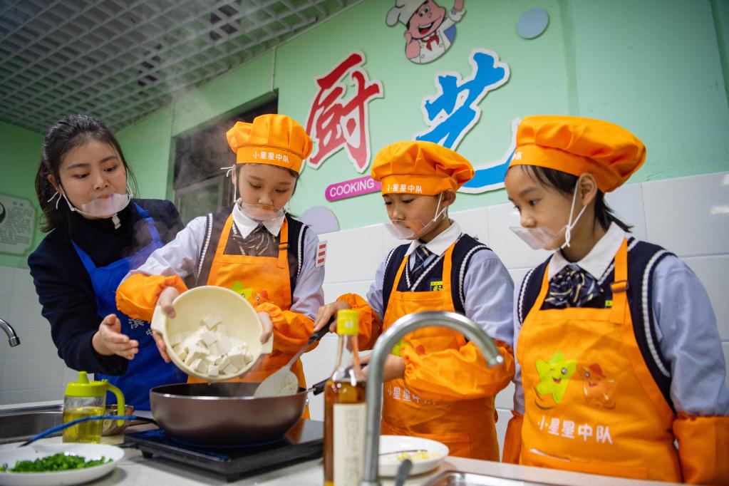 “這道麻婆豆腐色香味俱全!”“我覺得宮保雞丁更好吃……”學(xué)期末,重慶市沙坪壩區(qū)濱江小學(xué)的廚藝課迎來結(jié)課“廚藝秀”。同學(xué)們走進(jìn)廚藝工作室,起鍋、下菜、擺盤,爭相展示一學(xué)期下來的“學(xué)習(xí)成果”。