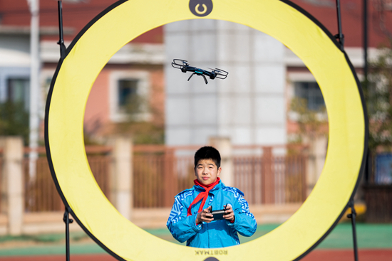 2021年12月14日,浙江省湖州市長(zhǎng)興縣第一小學(xué)的學(xué)生操作無人機(jī)進(jìn)行穿越訓(xùn)練。 視覺中國(guó)供圖(資料圖片)