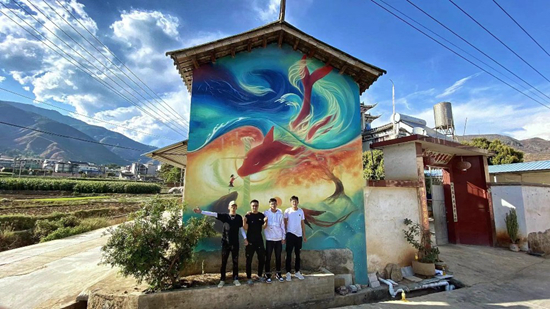 劉小備(左一)和團(tuán)隊伙伴在墻繪前合影。受訪者供圖