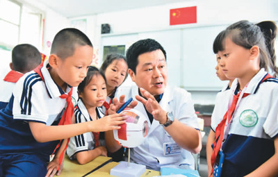 近日,在貴州省黔東南苗族侗族自治州從江縣城關(guān)第三小學,眼科醫(yī)生給學生講解健康用眼知識。(石宏輝 攝 人民視覺)