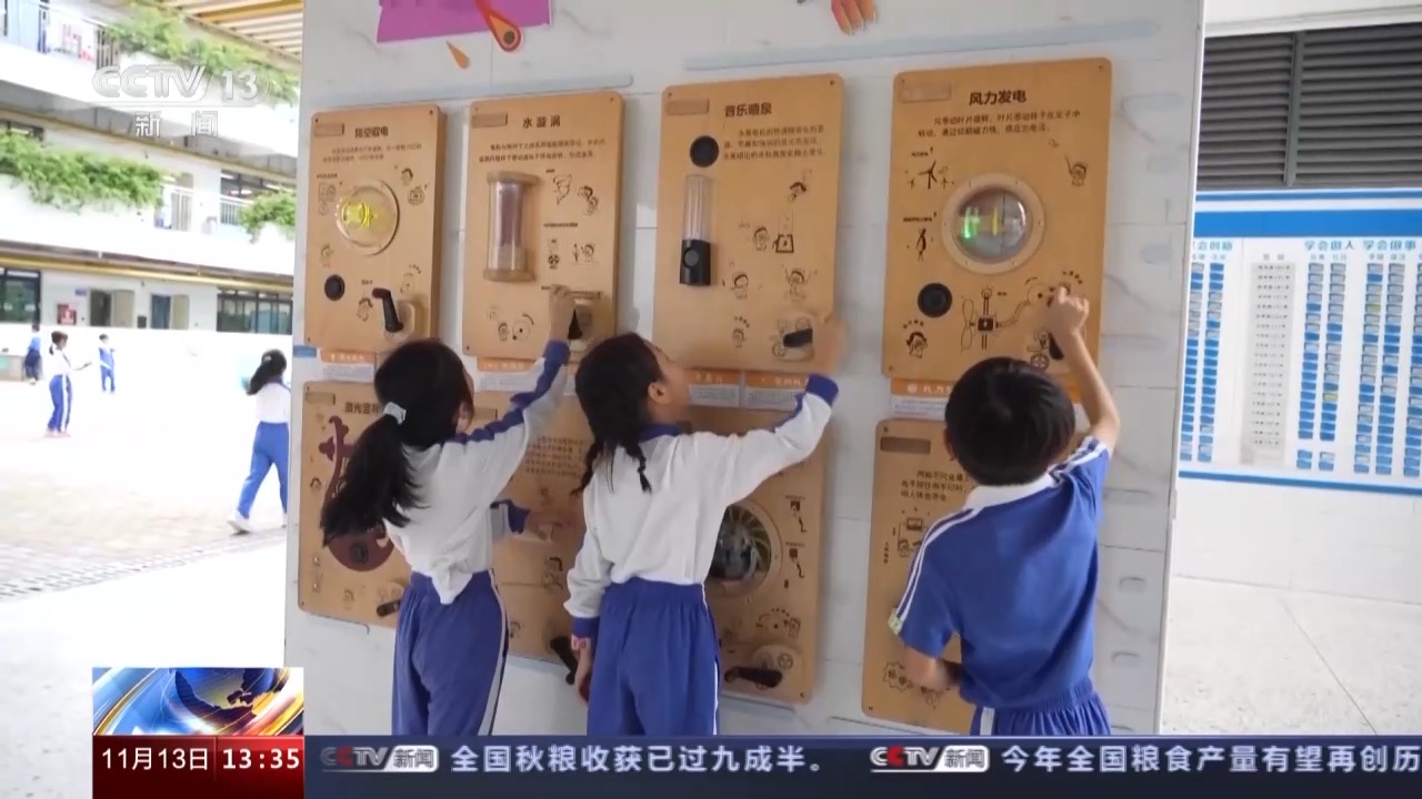 如果同學(xué)們課間不想運動,學(xué)校還在每層布置了科學(xué)互動角,“發(fā)電輪”“燈光隧道”“音樂噴泉”“水漩渦”等十幾個交互式科技項目也在課間對同學(xué)們開放。