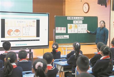 在上海市楊浦區(qū)平?jīng)雎返谌W(xué)的“教學(xué)助手”展示課上,老師在黑板上進行知識點講解分析,顯示屏上有學(xué)生們的人機互動結(jié)果和學(xué)習(xí)效果的統(tǒng)計數(shù)據(jù)。 新華社記者 劉穎攝