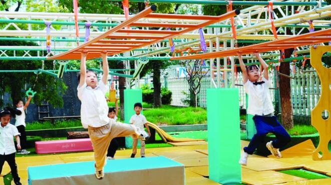 常州市五星幼兒園的負(fù)責(zé)人王艷表示,有一次同事將幾條外國幼兒園、小學(xué)低年級年齡段孩子進(jìn)行體能訓(xùn)練的視頻發(fā)了過來,視頻上的孩子能夠完成跳鞍馬、手倒立行走等動作。“于是,我們結(jié)合孩子們的意見,邀請專家共同繪制賽道構(gòu)思圖,將平衡、走、跑、跳、攀爬、懸掛等動作元素融為一體,打造出一個綜合性的體能游戲賽道?!?/p>
