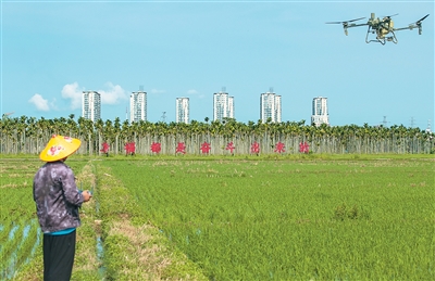 7月6日,海南省瓊海市嘉積鎮(zhèn)農(nóng)民在利用無(wú)人機(jī)噴灑農(nóng)藥。蒙鐘德攝(人民視覺(jué))
