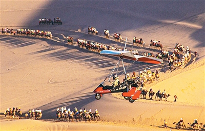 近年來(lái),在甘肅省敦煌市鳴沙山月牙泉景區(qū)運(yùn)營(yíng)的敦煌“飛天”通用航空項(xiàng)目,為游客提供低空飛行器旅游服務(wù),讓游客乘坐直升機(jī)、動(dòng)力滑翔機(jī),從空中欣賞大漠綠洲和月牙泉美景,沉浸式體驗(yàn)敦煌獨(dú)特魅力。圖為7月3日,游客乘坐滑翔機(jī)空中俯瞰敦煌大漠風(fēng)光。王斌銀攝(人民視覺(jué))