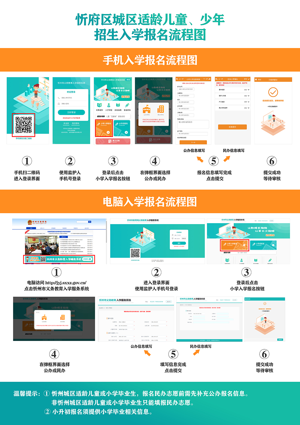 忻州市城區(qū)義務(wù)教育階段學(xué)校招生入學(xué)系統(tǒng)報(bào)名流程示意圖