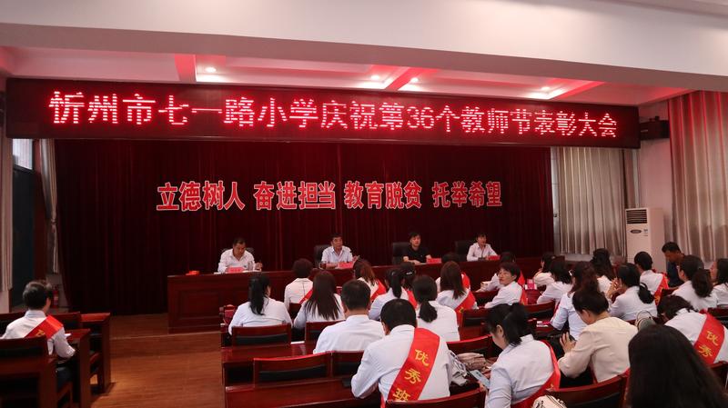 金風送爽,涼霜驚秋。伴隨著時光款款的腳步,相攜著歲月累累的果實,為傳承尊師重教的文明火種,增強教師的光榮感、責任感、使命感,培養(yǎng)學生尊師重教的良好品德,在第36個教師節(jié)即將來臨之際,9月9日下午,忻州市七一路小學舉行了“立德樹人奮進擔當,教育脫貧托舉希望”第36個教師節(jié)表彰活動,會議由郭彥君副校長主持,全體教職工參加了表彰大會。