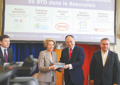 本報(bào)法國(guó)博韋3月23日電 (記者曹鵬程、殷新宇、李鶴)中國(guó)企業(yè)比亞迪23日在此間宣布,向法國(guó)上法蘭西大區(qū)投資1000萬(wàn)歐元,成立電動(dòng)汽車組裝廠。比亞迪歐洲區(qū)總經(jīng)理何一鵬、上法蘭西大區(qū)議會(huì)主席格扎維埃·貝特朗、博韋市市長(zhǎng)卡洛琳娜·卡耶出席了新聞發(fā)布會(huì)。