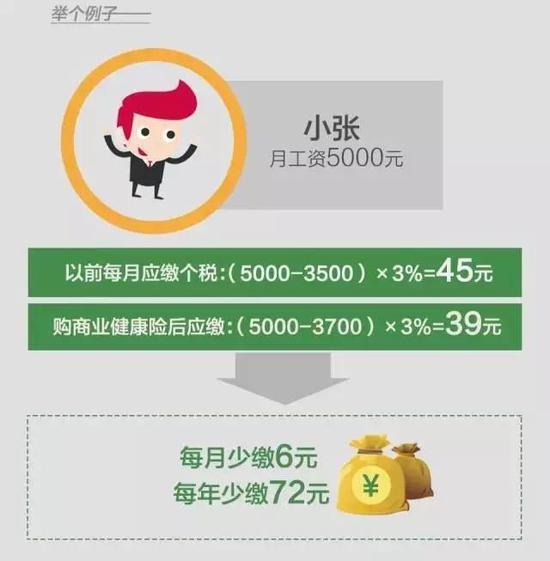 可以抵扣多少?每年不超過(guò)2400元 《通知》指出對(duì)個(gè)人購(gòu)買符合規(guī)定的商業(yè)健康保險(xiǎn)產(chǎn)品的支出,允許在當(dāng)年(月)計(jì)算應(yīng)納稅所得額時(shí)予以稅前扣除 ,扣除限額為2400元/年,即200元/月。 同時(shí)《通知》指出,單位統(tǒng)一組織為員工購(gòu)買或者單位和個(gè)人共同負(fù)擔(dān)購(gòu)買符合規(guī)定的商業(yè)健康保險(xiǎn)產(chǎn)品,單位負(fù)擔(dān)部分應(yīng)當(dāng)實(shí)名計(jì)入個(gè)人工資薪金明細(xì)清單,視同個(gè)人購(gòu)買,并自購(gòu)買產(chǎn)品次月起,在不超過(guò)200元/月的標(biāo)準(zhǔn)內(nèi)按月扣除。一年內(nèi)保費(fèi)金額超過(guò)2400元的部分,不得稅前扣除。以后年度續(xù)保時(shí),按上述規(guī)定執(zhí)行。 也就是說(shuō),如果你購(gòu)買的保險(xiǎn)每個(gè)月分?jǐn)傁聛?lái)超過(guò)200元,其實(shí)是相當(dāng)于你的個(gè)稅起征點(diǎn)提高了200元。