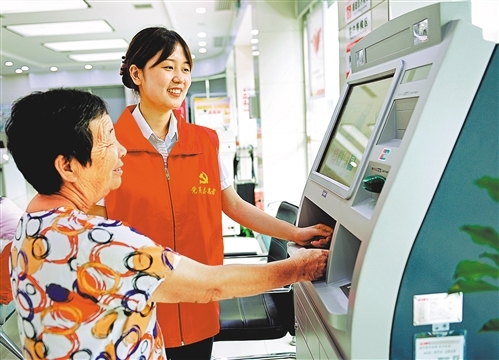 湖南邵陽(yáng)農(nóng)商銀行黨員志愿者向客戶介紹銀行查詢機(jī)使用方法。滕治中攝(中經(jīng)視覺(jué))