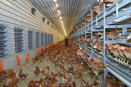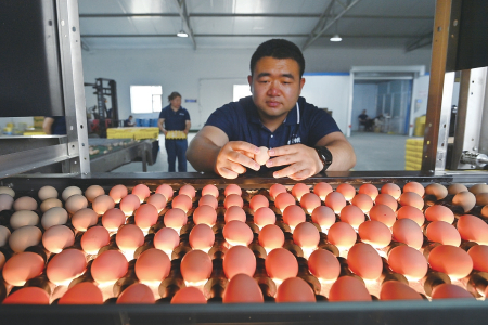 在雞舍集蛋臺(tái)前檢驗(yàn)雞蛋。