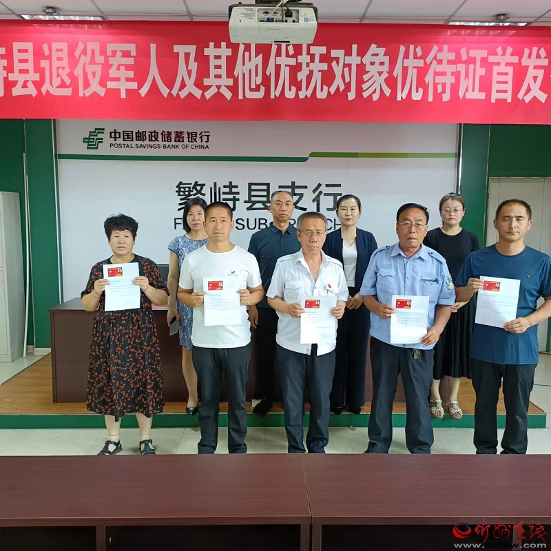 7月19日,繁峙縣退役軍人事務(wù)局與中國郵政儲蓄銀行繁峙縣支行聯(lián)合舉行了繁峙縣退役軍人及其他優(yōu)撫對象優(yōu)待證首發(fā)儀式,現(xiàn)場為5名退役軍人代表發(fā)放了優(yōu)待證,標(biāo)志著繁峙縣退役軍人及其他優(yōu)撫對象優(yōu)待證發(fā)放工作正式開始??h退役軍人事務(wù)局副局長李萬壽、事務(wù)局優(yōu)撫中心主任降銀鳳、郵儲銀行繁峙支行行長秦媛出席發(fā)放儀式。