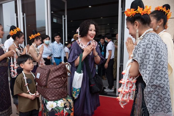 在中老鐵路老撾磨丁站,工作人員歡迎乘坐D887次國(guó)際旅客列車(chē)的旅客抵達(dá)磨?。?023年4月13日攝)。新華社發(fā)(凱喬 攝)
