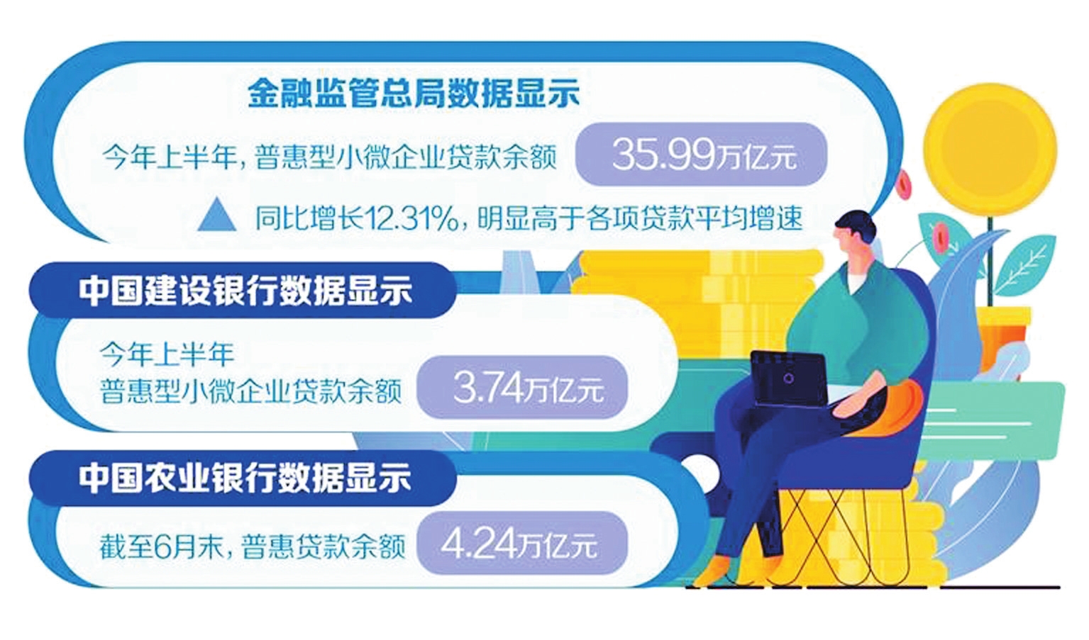 小微企業(yè)是經濟發(fā)展的生力軍、就業(yè)的主渠道、改善民生的重要支撐。金融監(jiān)管總局統(tǒng)計數據顯示,上半年,普惠型小微企業(yè)貸款增長較快,普惠型小微企業(yè)貸款余額35.99萬億元,同比增長12.31%,明顯高于各項貸款平均增速。