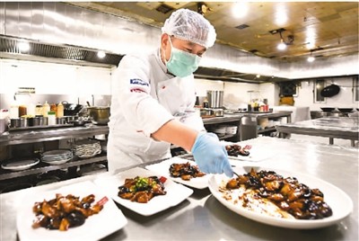 4月13日,在河北廊坊市安次區(qū)一家餐廳,廚師為客人分餐。新華社發(fā)