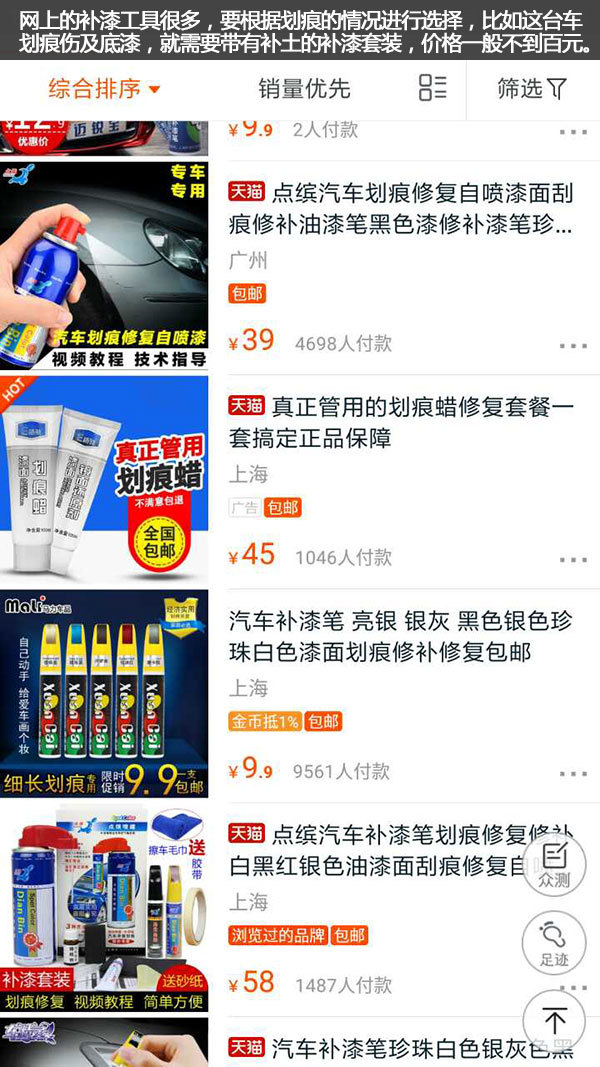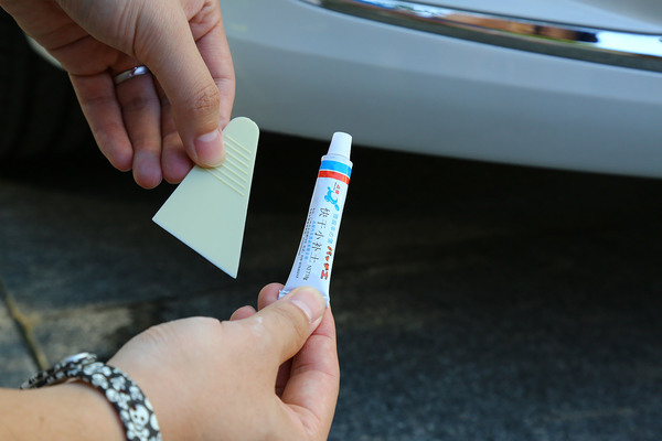 可以看到這輛車的劃痕傷至底漆了,為了更好的固漆,我們需要進行簡單的補土或者叫打膩子,對凹凸不平之處也可以很好的找平。這種小管的補土很便宜,電商賣10元左右,而全套的補漆工具不足百元。