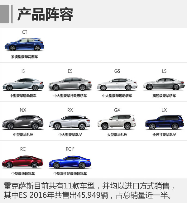 2016年12月,雷克薩斯共售出10,662輛,同比增長(zhǎng)5.3%;1-12月累計(jì)銷(xiāo)量達(dá)109,150輛,已經(jīng)超額完成10萬(wàn)輛的銷(xiāo)量目標(biāo)。在各大豪華品牌不斷加深國(guó)產(chǎn)化進(jìn)程的現(xiàn)階段,雷克薩斯自2004年建立獨(dú)立經(jīng)銷(xiāo)商網(wǎng)絡(luò)后,一直保持以進(jìn)口方式銷(xiāo)售的豪華品牌。在十多年的發(fā)展中,其產(chǎn)品矩陣越來(lái)越豐富。