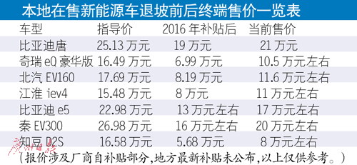 春節(jié)剛過,原計(jì)劃買輛純電動(dòng)車上下班用的番禺市民劉先生,在去4S店轉(zhuǎn)了一圈后,開始猶豫了。原本看中的一款車,最終購車預(yù)算比去年年底多了好幾萬元。車商告訴他,因?yàn)椤把a(bǔ)貼退坡”,1月份還能以15.98萬元買到的一輛純電動(dòng)新能源汽車,現(xiàn)在漲到20.38萬元左右。劉先生表示,補(bǔ)貼少已成定局,他決定與家人再等兩三個(gè)月,看有沒有性價(jià)比更高的新能源車可選,不然就將配置需求降低,買一輛更便宜的電動(dòng)車。