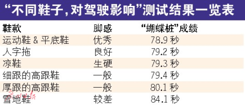 為讓測試更加接近于真相,此次測試專門請來一位女士參與。她穿上不同的鞋子駕駛同樣一輛汽車。測試項目分兩種,一是直觀感受,駕駛員描述不同鞋子對駕駛習(xí)慣的影響;二是讓數(shù)據(jù)說話,穿上不同的鞋子挑戰(zhàn)經(jīng)典的場地測試項目“蝴蝶樁”,看所耗時間的多與少。
